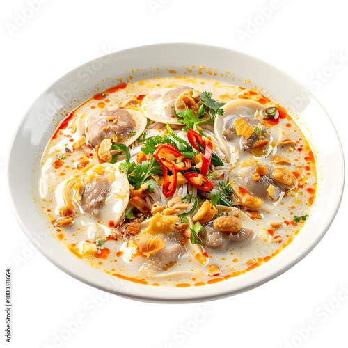 Delicious bowl of zesty dumpling soup topped with herbs, chili peppers, and crunchy toppings, featuring bright colors and a variety of textures