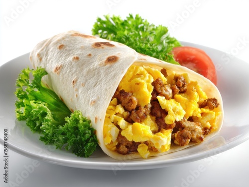 Delicious breakfast burrito filled with scrambled eggs, seasoned ground beef, melted cheese, fresh vegetables, served on a white plate with greens and tomato