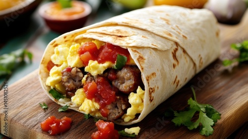 Delicious Breakfast Burrito with Scrambled Eggs, Sausage, and Salsa