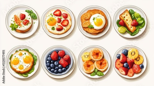 Delicious breakfast plates with eggs, fruits, and pastries