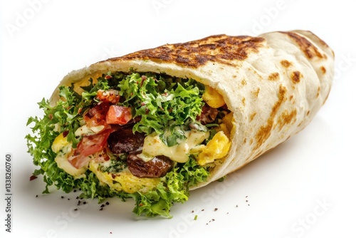 Delicious burrito with fresh vegetables and sauce close up shot on white background for restaurant menu