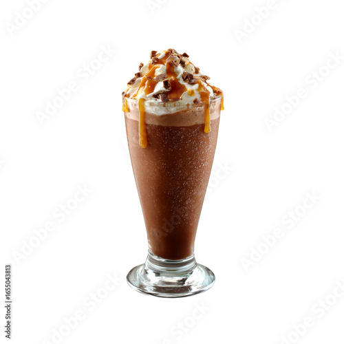 Delicious Caramel Chocolate Frappe with Whipped Cream and Chocolate Pieces