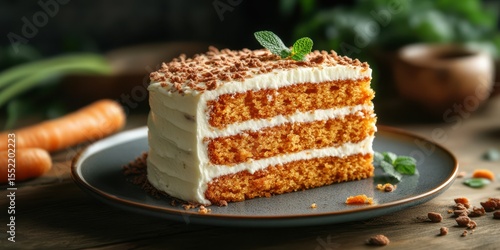 Delicious carrot cake layered with cream frosting and topped with chocolate shavings on a rustic wooden table