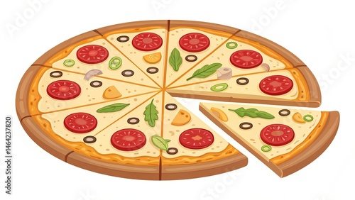 Delicious cartoon pizza with fresh vegetables and a slice cut away on white background
