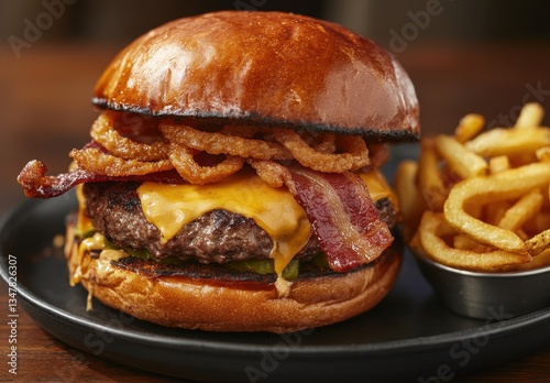 Delicious cheeseburger with crispy bacon, gooey cheese, onion rings, pickles, and golden fries on a stylish black plate, served in a restaurant setting