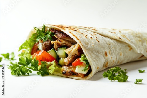 Delicious chicken shawarma wrap with fresh vegetables and white sauce on bright background studio shot food photography