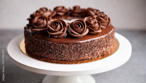 delicious chocolate cake decorated with chocolate roses and chocolate shavings on a white cake stand