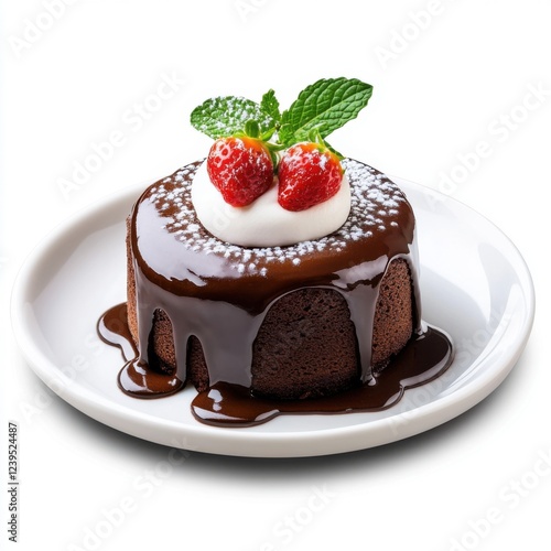 Delicious chocolate molten cake topped with fresh strawberries and whipped cream on a white plate