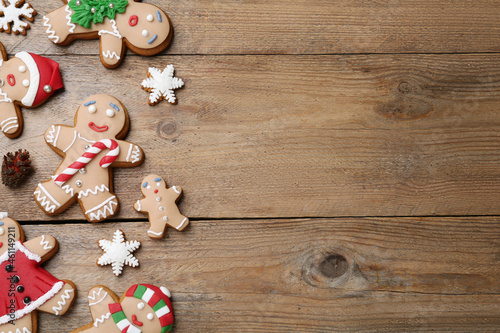 Delicious Christmas cookies on wooden table, flat lay. Space for text