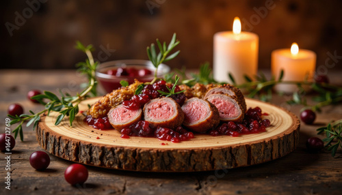 Delicious cooked meat with cranberry sauce on wooden serving board