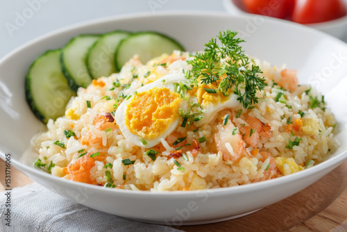 Delicious fried rice with salted egg, shrimp, and fresh cucumber slices garnished with herbs