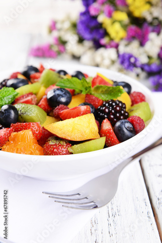 Delicious fruits salad in plate on table close-up