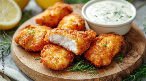 Delicious golden-brown fish bites served on a wooden platter with a creamy dipping sauce and fresh herbs, perfect for a satisfying meal or appetizer.