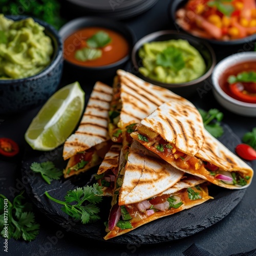 Delicious grilled quesadillas with various toppings on a black plate.