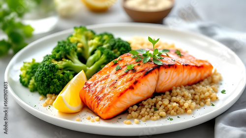 Delicious grilled salmon steak with broccoli and couscous, a healthy and vibrant meal for any occasion