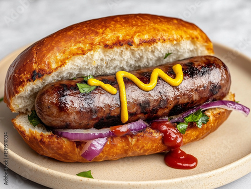 Delicious grilled sausage in a pretzel bun with mustard and ketchup