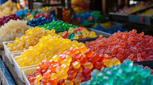 delicious gummies stand with a lot of variety of flavors and colors on the street
