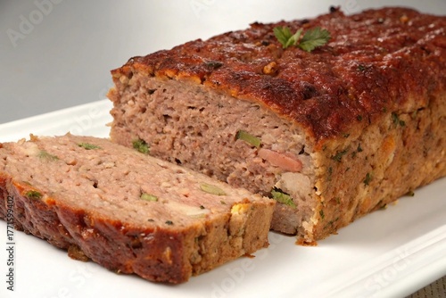 Delicious homemade meatloaf with a savory glaze and slice served on white plate
