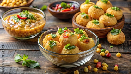 Delicious Indian street food Pani Puri filled with chickpeas, spicy tangy water, and fresh garnishes , Indian, street food