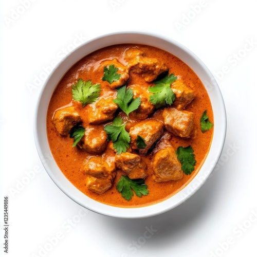Delicious Indian Style Curry Dish with Tender Meat and Fresh Coriander in a White Bowl