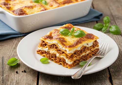 Delicious lasagna served on white plate with fresh basil, sitting on a rustic wooden table, looks tasty