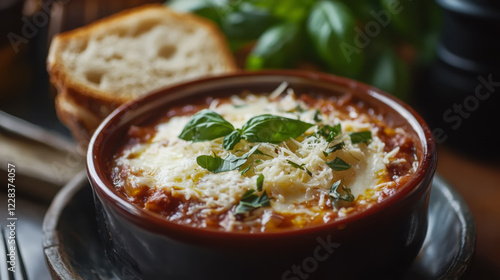 Delicious lasagna soup with fresh basil and shredded cheese in a rustic setting