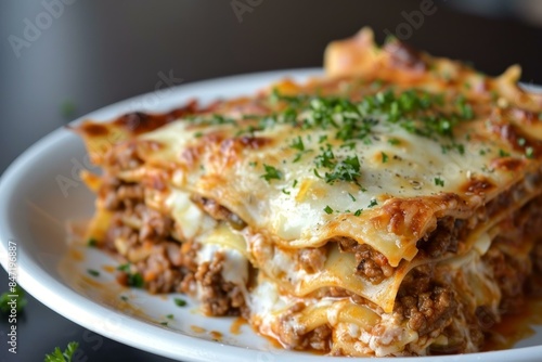Delicious lasagna with melted cheese and greens being served on white plate