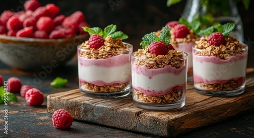 Delicious layered raspberry yogurt parfaits served with fresh berries on a rustic wooden board