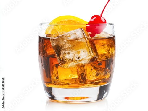 Delicious old fashion cocktail in the etched glass with ice and orange slices, isolated on white
