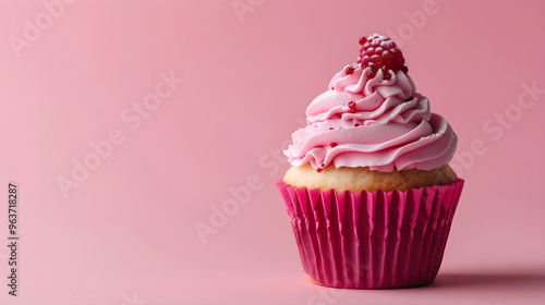 Delicious pink cupcake with sprinkles sits on a matching bubblegum pink background. Sweet indulgence.