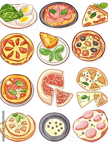 Delicious pizza and egg dishes, food collage, white background, recipe illustration