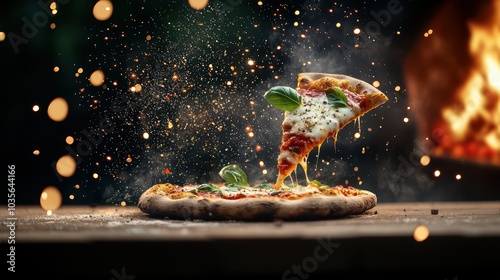 Delicious pizza slice lifting above a fresh pie, with cheese stretching and sparks flying around, set in a cozy kitchen atmosphere.