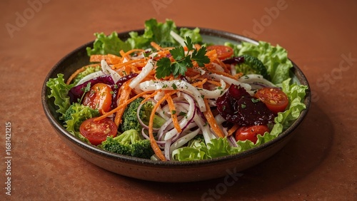 Delicious plant-based salad with a mix of lettuce, broccoli, carrots, cabbage, beets, and tomato