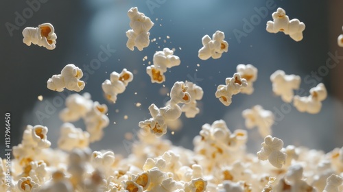 Delicious popcorn kernels exploding and floating in mid-air, creating a dynamic and appetizing image perfect for food and movie-related projects.