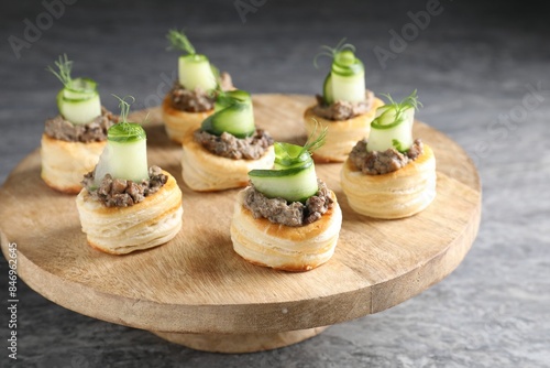 Delicious puff pastry with mushrooms, cucumber and dill on grey table