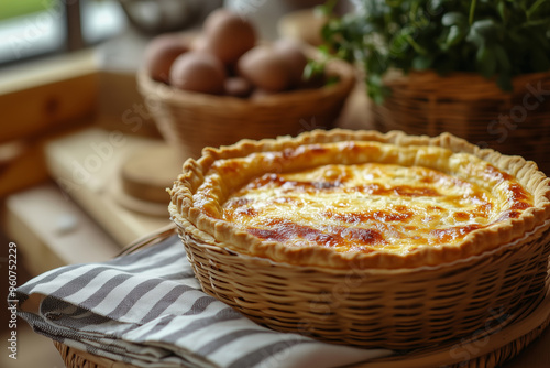 Delicious Quiche Lorraine in woven basket with rustic decor and fresh ingredients on a wooden table