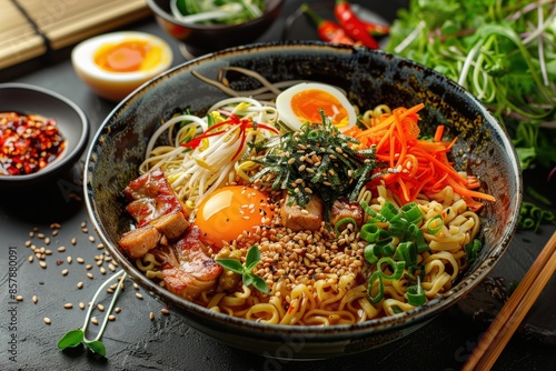 Delicious Ramen Noodles with Pork, Soft Boiled Egg, Carrots, Bean Sprouts, Nori, Sesame Seeds, and Green Onions in a Black Bowl