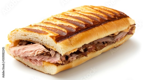Delicious roast beef sandwich white background food photography minimalist style close-up culinary delight