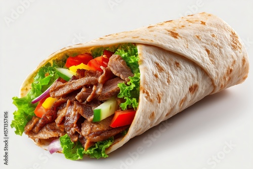 Delicious shawarma wrap filled with tender meat and fresh vegetables displayed on a clean white background