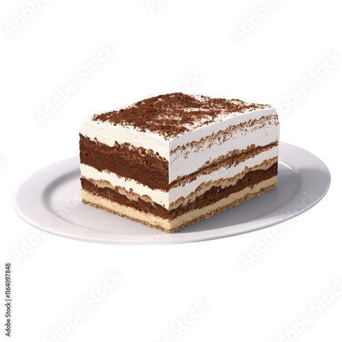 Delicious slice of tiramisu showcasing layers of coffee, cream, and chocolate on a pristine white plate