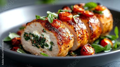 Delicious Stuffed Chicken Breast with Roasted Tomatoes Fresh Herb Garnish Closeup