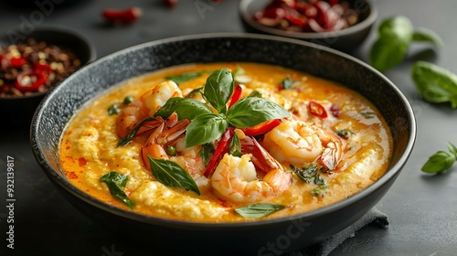 Delicious Thai Shrimp Curry with Basil and Chili Peppers.