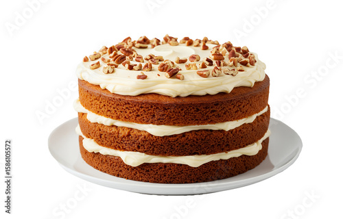 Delicious Three Layer Carrot Cake with Cream Cheese Frosting and Pecan Topping PNG Isolated on Transparent Background