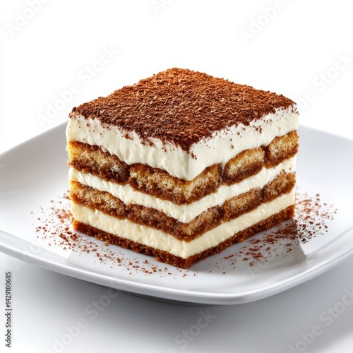 Delicious tiramisu dessert close up on white background