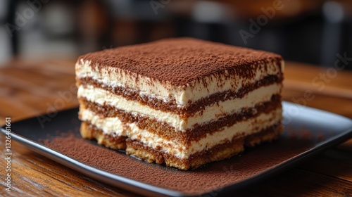 Delicious Tiramisu Slice on a Black Plate