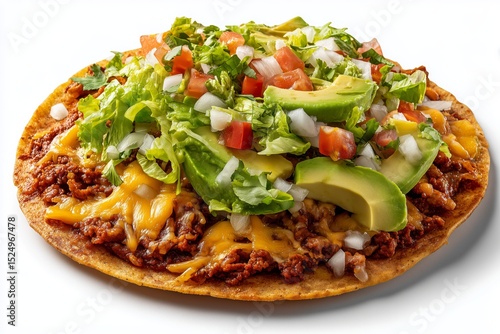 Delicious Tlayuda topped with refried beans, cheese, lettuce, avocado, and meats showcasing the rich flavors of Oaxaca cuisine on a white background