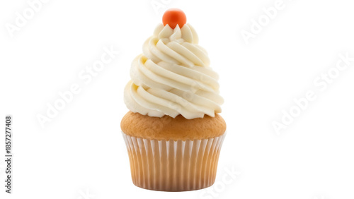 Delicious vanilla cupcake with swirl frosting and orange candy isolated PNG, sweet treat for birthdays and celebrations on transparent background