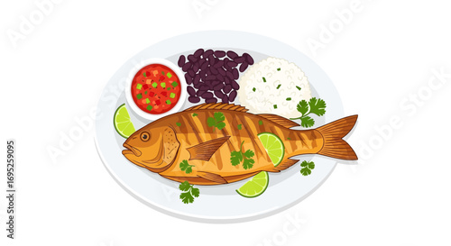 Delicious whole fried fish dish with rice, black beans, and salsa garnish