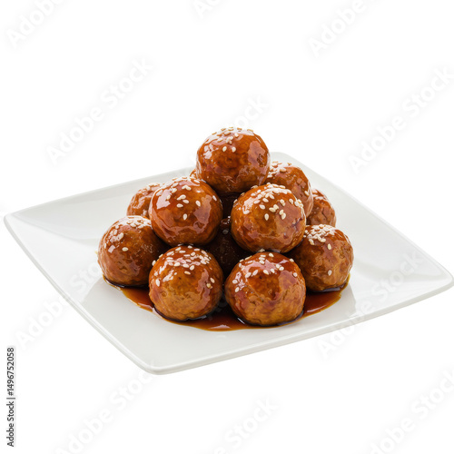 Deliciously arranged meatballs drizzled with sauce on a white plate, perfect for food photography