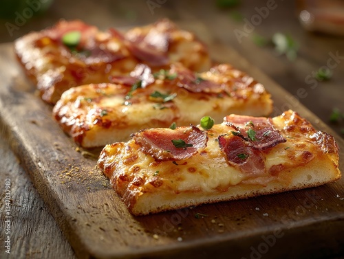 Deliciously Fresh Pizza with Crispy Toppings Served on a Wooden Board Surrounded by Herbal Garnishes and Warm Lighting for Culinary Delight